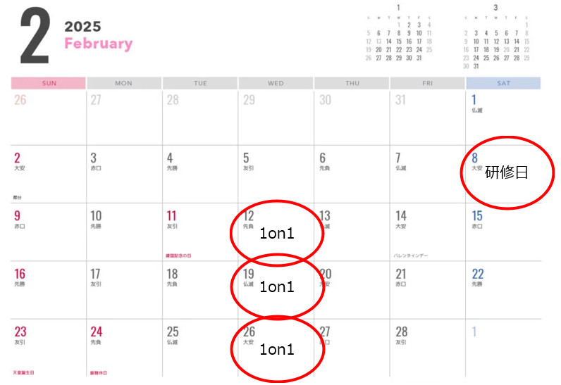月1回の研修では身につきづらい、「考え方・価値観」や「必要な知識・技術」を1on1でフォローします。